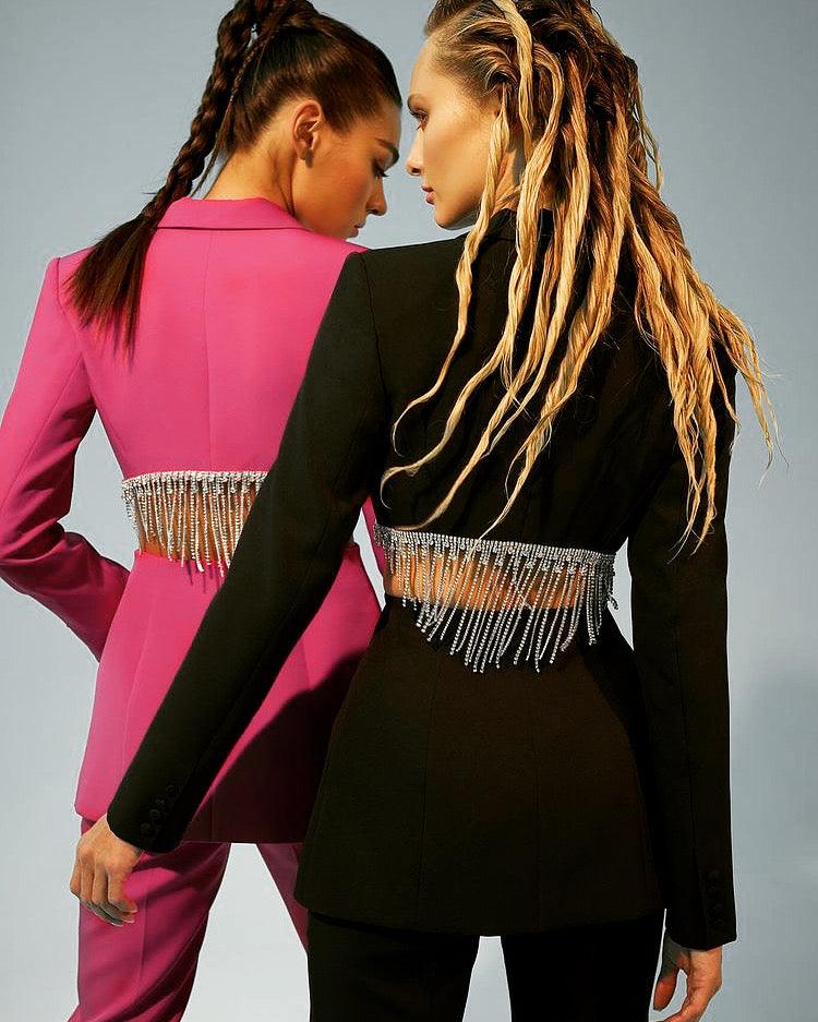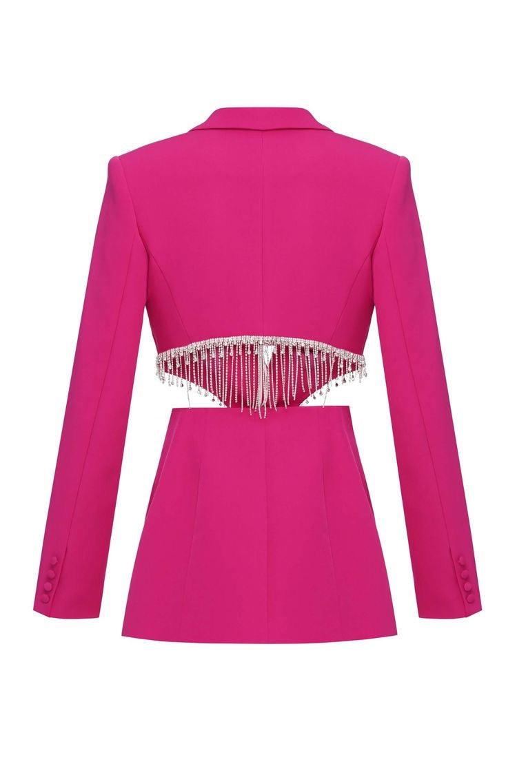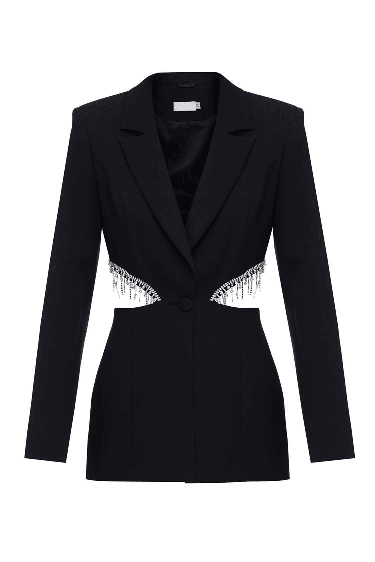 Fabric: The Single-breasted blazer is made of Suit Crepe. It features branded Silk Lining, Button Closure, and Handmade stones decoration along the Cutouts. The back length of the Blazer from the Collar Seam to the bottom is 27. The Sleeve`s length is 38.